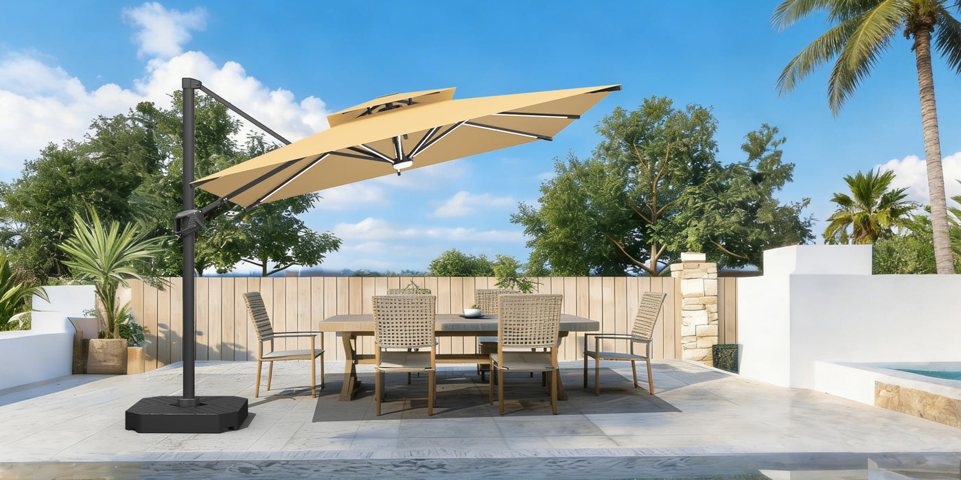 Patioslife Aegis Premium Cantilever Parasol met LED Verlichting, Glasvezel Ribs, Poedercoating Aluminium Stok & Beschermhoes — Luxe Tuin- en Terrasschaduw