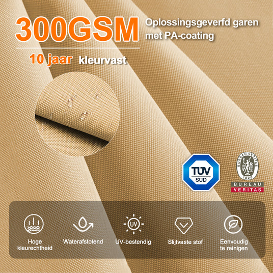 Gemaakt van 300 g/m² geverfd polyester biedt het doek UV-bescherming, gecertificeerd door Bureau Veritas en TÜV, en blokkeert 99,9% van de schadelijke UV-stralen. Het materiaal is waterafstotend en bijzonder kleurvast, met een levensduur tot 10 jaar. (Certificaat op aanvraag beschikbaar.)