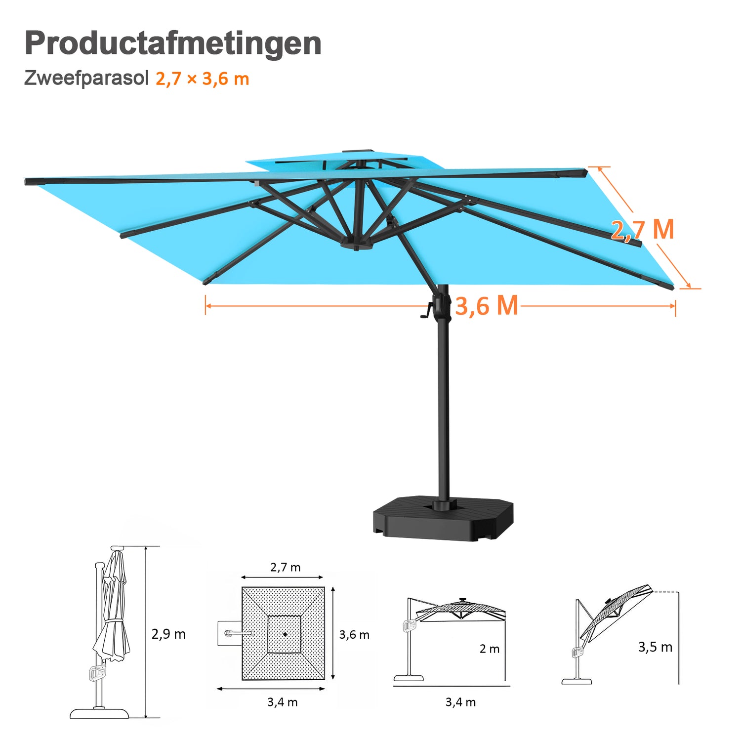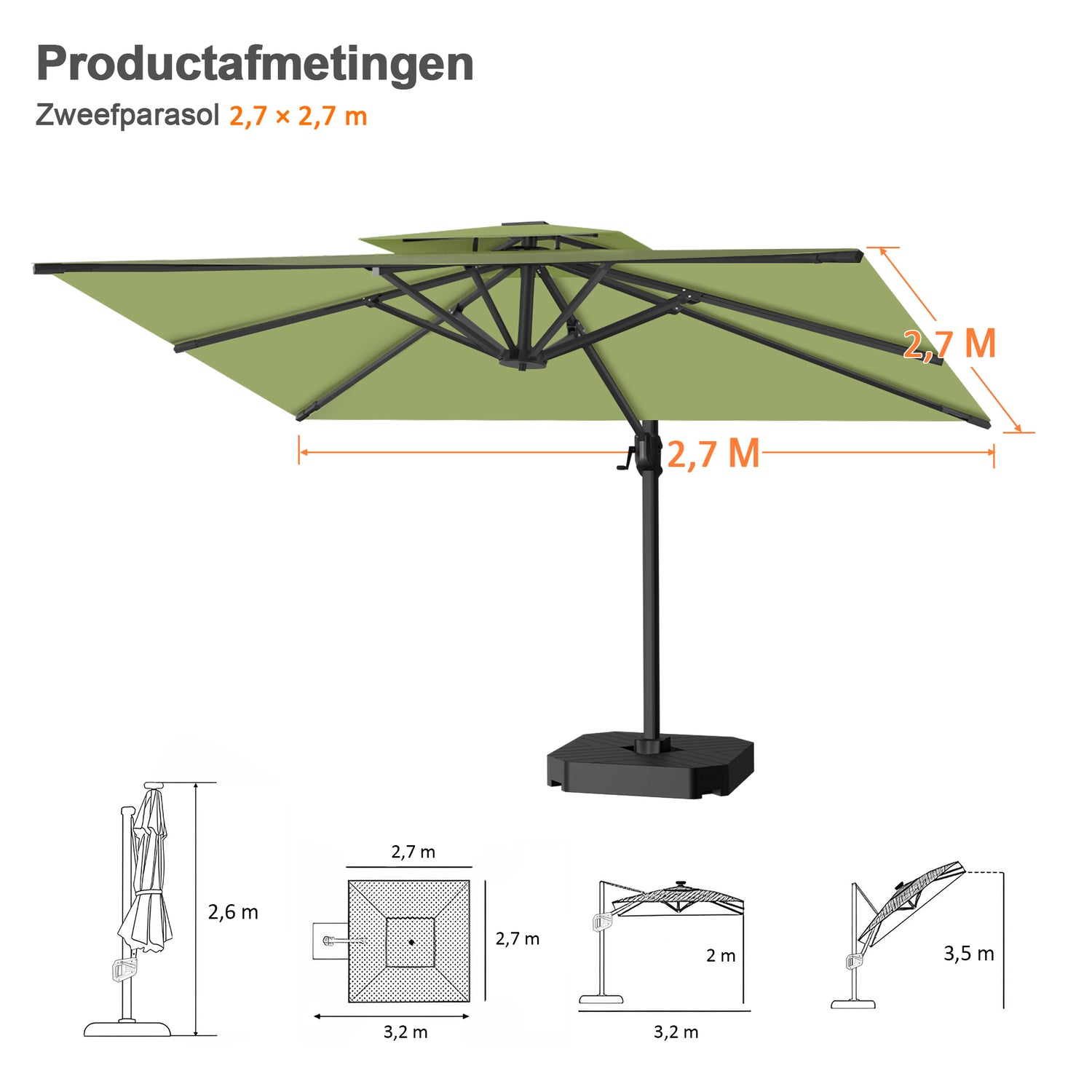 Opmerking: Elke parasol wordt geleverd met een metalen kruisvoet. Voor optimale stabiliteit en veiligheid raden we aan de kruisvoet niet alleen te gebruiken. Koop apart een compatibele verzwaarde voet of kies voor ons "Parasol + Rollende Voet Bundle" – deze bundel bevat een speciaal ontwikkelde verzwaarde voet met wielen die de parasol veilig ondersteunt en tegelijkertijd eenvoudig te verplaatsen is.