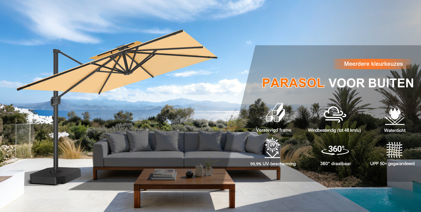 Creëer een stijlvolle, schaduwrijke oase met onze hoogwaardige parasol – perfect voor terrassen, tuinen en zwembadgebieden.