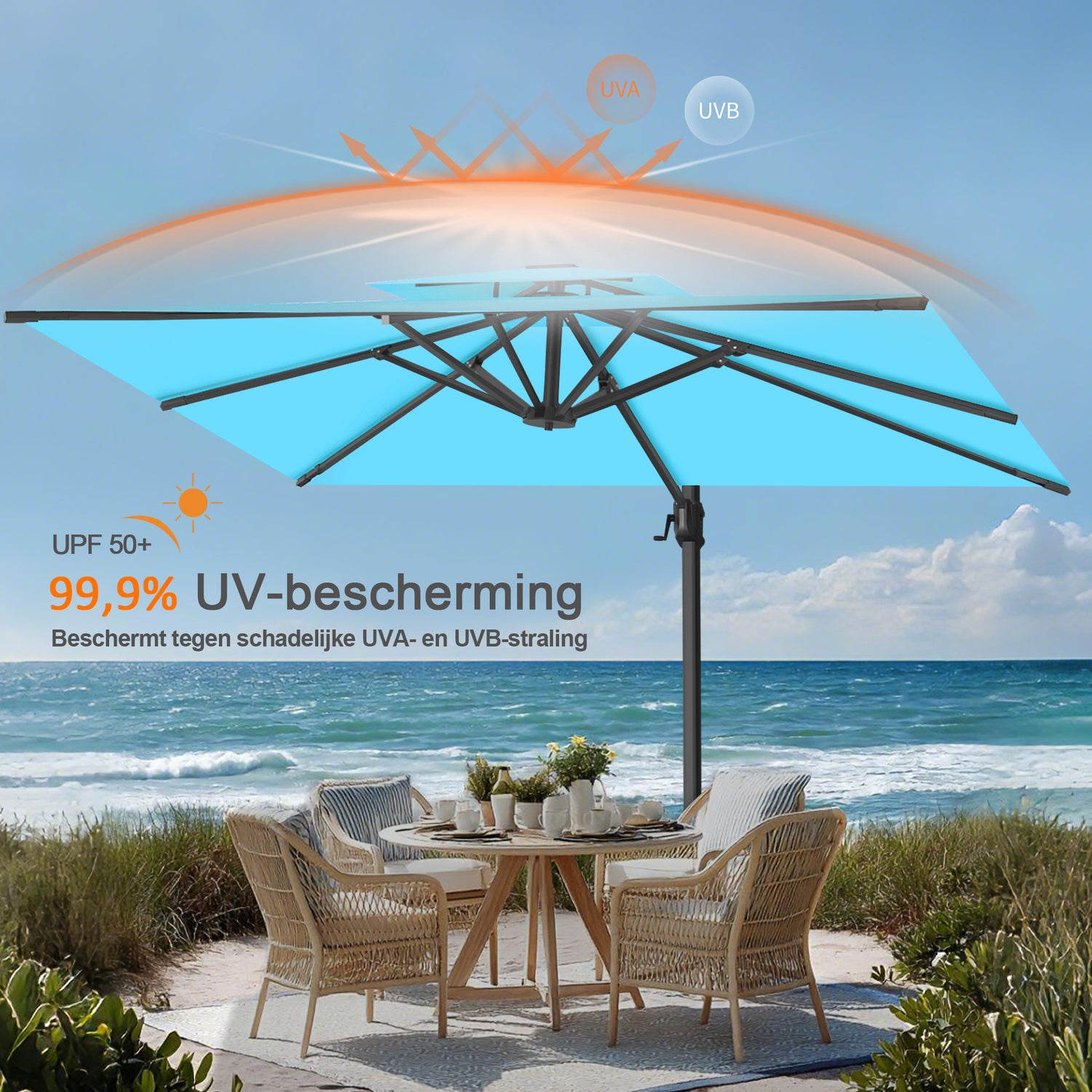 Deze parasol is gemaakt om winderige dagen te weerstaan en schadelijke UV-stralen te blokkeren, en biedt 9m² betrouwbare schaduw—perfect om uw gasten koel te houden en uw terras de hele dag lang te beschermen.