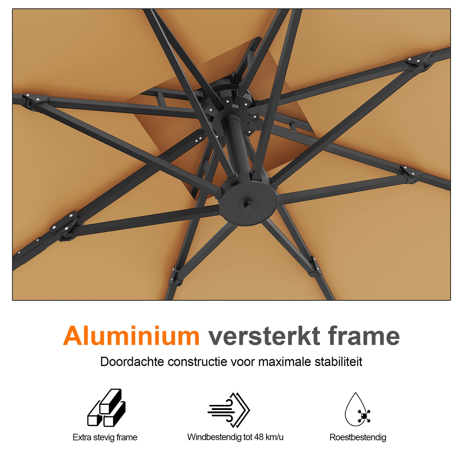 Patioslife Aegis Pro™ Cantilever Parasol met Kruisvoet — Robuust Frame en Poedergecoat Aluminium Paal voor Tuin en Terras - 300x300 cm / Bruin / Alleen Parasol is nabesteld en wordt verzonden zodra het weer op voorraad is.