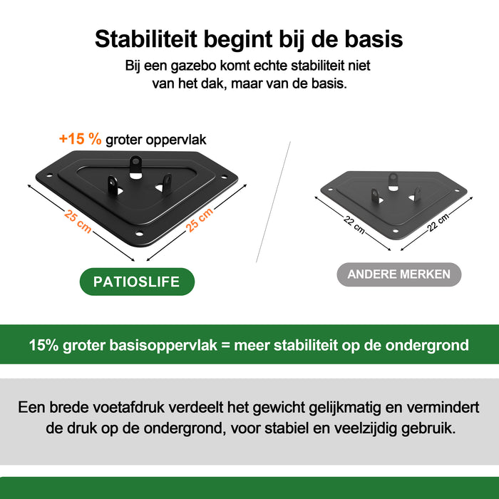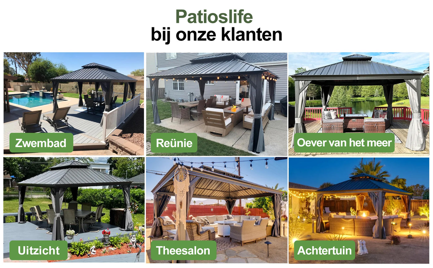 In Europa bieden wij de laagste prijzen voor dezelfde hoogwaardige gazebos, zonder concessies te doen aan de kwaliteit. Bij Patioslife geloven we in het leveren van uitzonderlijke service en producten die lang meegaan.