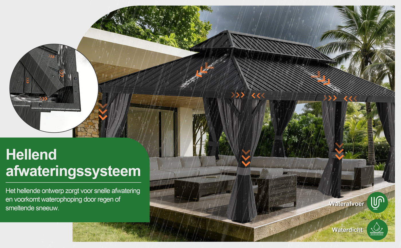 Ja. Het gegalvaniseerde stalen dak met dubbele ventilatie is volledig weerbestendig. Geïntegreerde afvoerkanelen leiden het regenwater af om ophoping te minimaliseren. Bij langdurige regenbuien veeg overtollig water weg en houd de goten en afvoeren vrij.