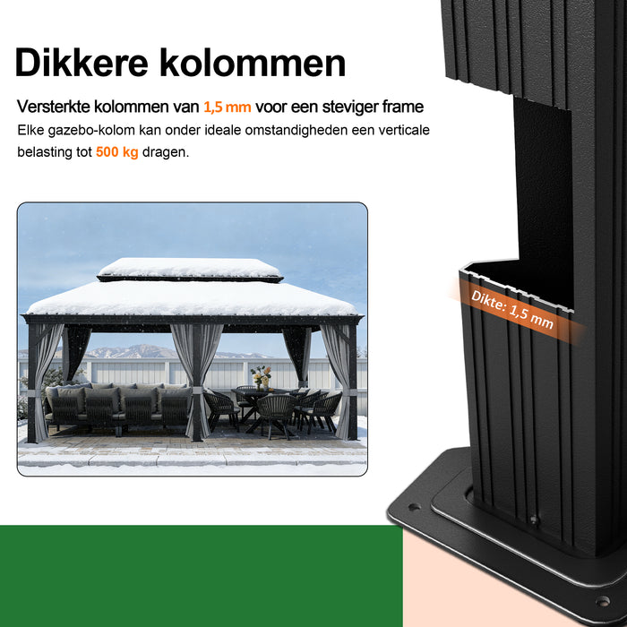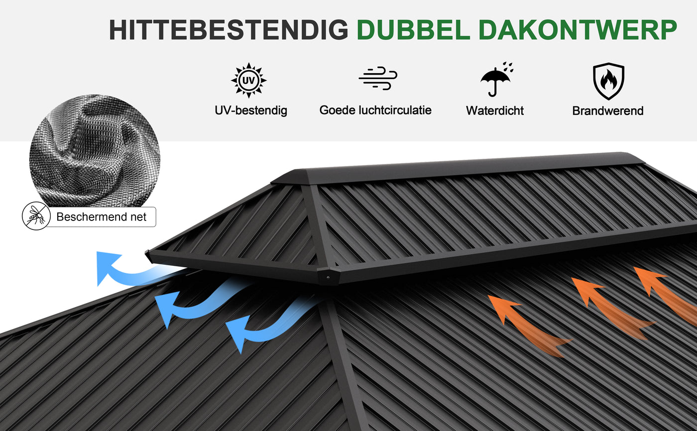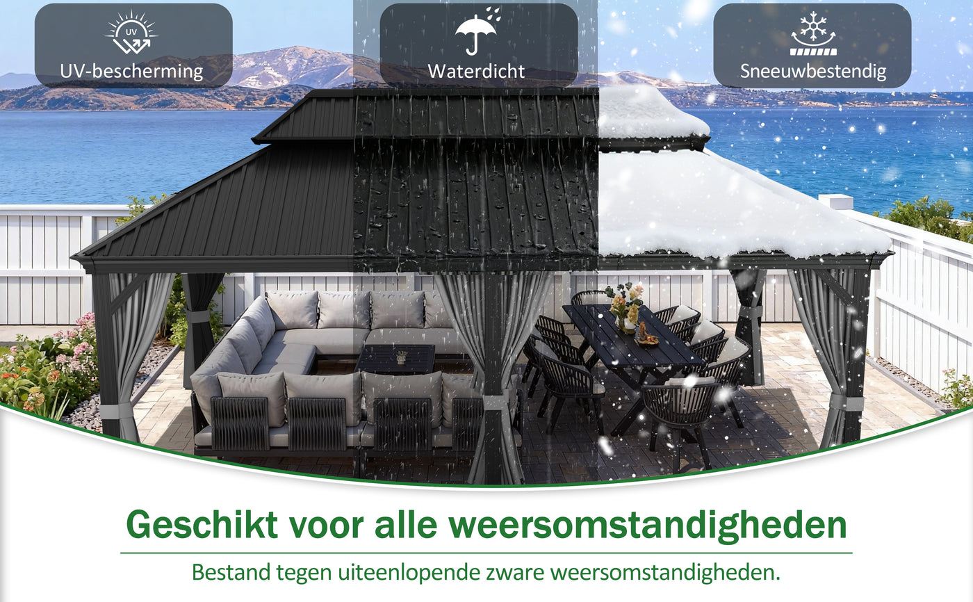 Ja. Het is ontworpen voor het gebruik het hele jaar door. Het harde dak biedt 99% UV-bescherming (UPF 50+) en is geschikt voor een sneeuwbelasting van 22 lbs/ft². Verwijder in gebieden met zware sneeuwval snel de opgehoopte sneeuw om de constructie te beschermen.
