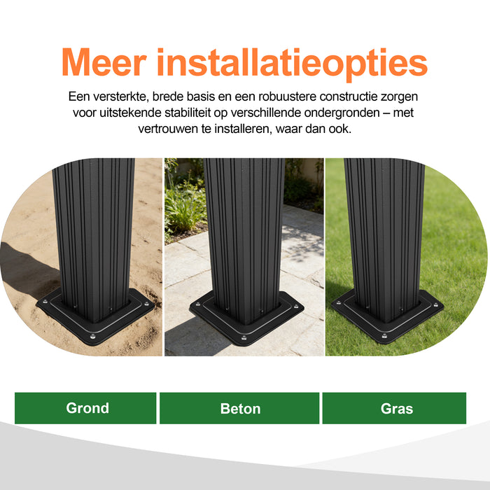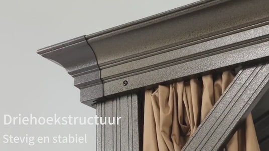 - Stevig Poedergecoat Aluminium Frame – Lichtgewicht maar sterk, met een elegante houtnerfafwerking die perfect past bij elke tuin. Let op: de framekleur is overal hetzelfde; alleen de kleur van de gordijnen verschilt (Grijs of Bruin).