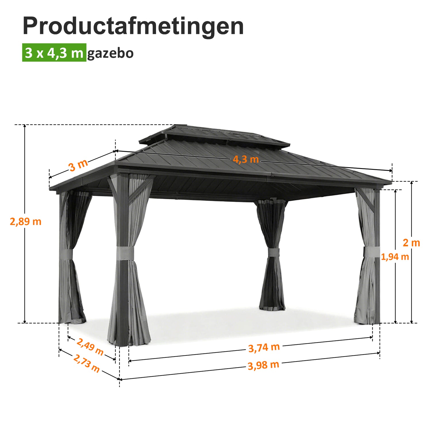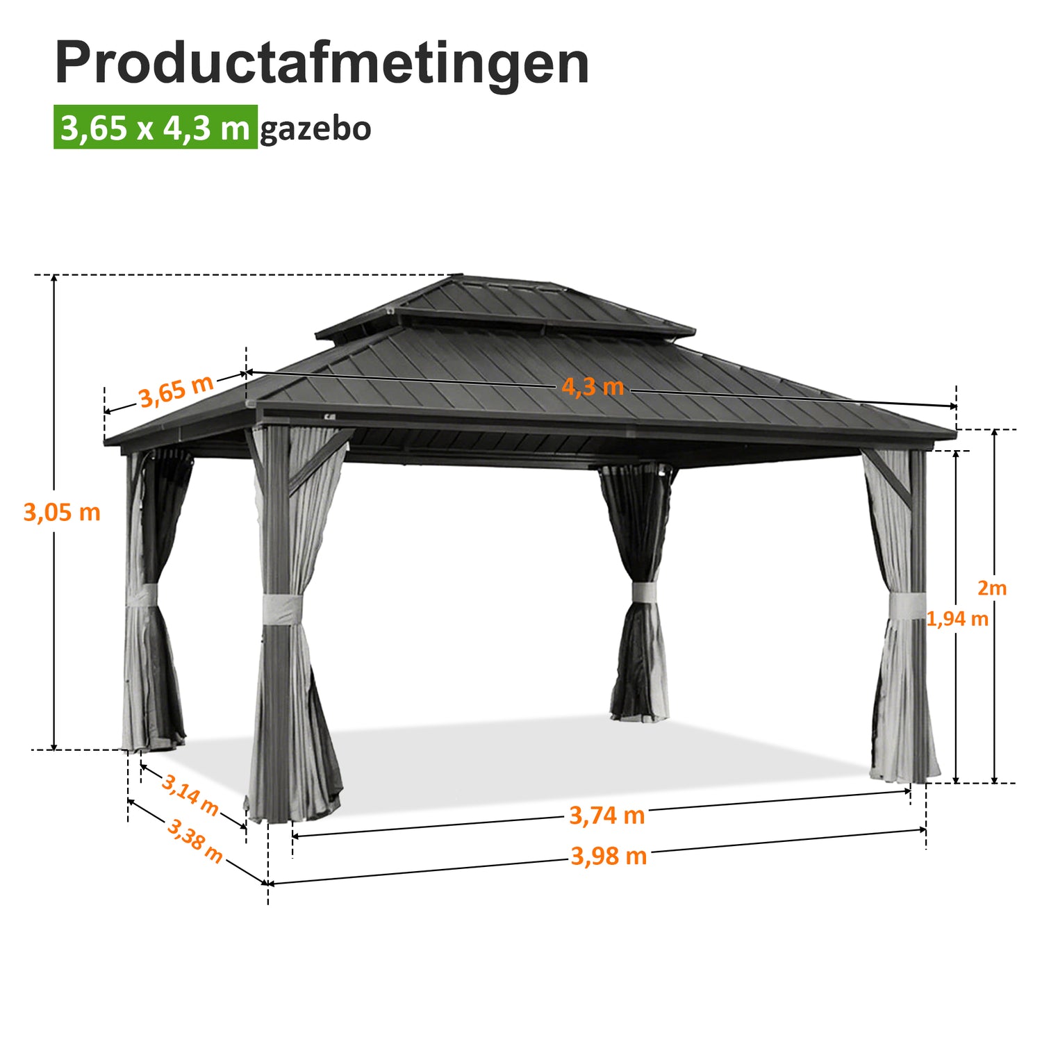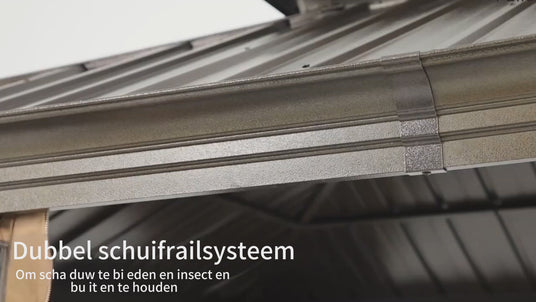Het pakket bevat het aluminium frame met poedercoating, gegalvaniseerde stalen dakpanelen, het dubbelrailsysteem, gordijnen & netten, plafondhaak, bevestigingsmaterialen en verankeringen. Met 2–5 personen duurt de montage een paar uur. Een vlakke, stevige ondergrond is vereist; professionele installatie wordt aanbevolen voor het beste resultaat.