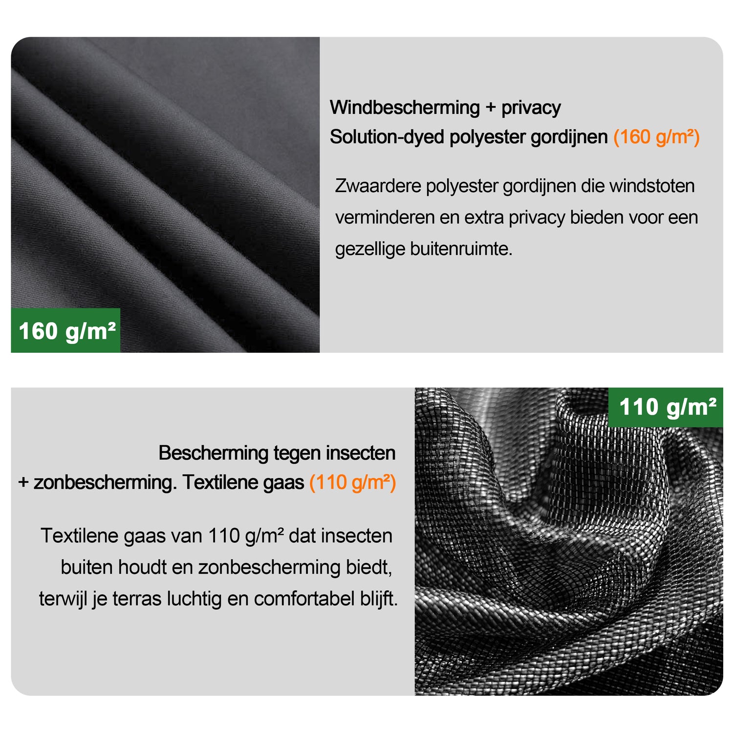 - Privacy & Comfort – Inclusief afneembare polyester gordijnen en fijnmazig gaas met soepele ritssluitingen, voor schaduw, ventilatie en bescherming tegen insecten.